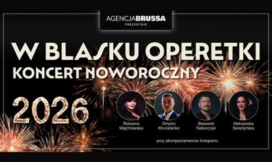 Czterech znakomitych solistów i pianistka zabiorą Państwa w muzyczną podróż pełną wdzięku, humoru i emocji. W programie znajdą się największe operetkowe przeboje i światowe hity: "Wielka sława to żart", "Czardasz Silvy", "Usta milczą", a także "New York, New York", "My Way", "Malade" czy finałowe "Happy New Year" i "Feliz Navidad". To pełen klasy, lekkości i radości koncert, w którym magia sceny łączy się z noworoczną energią, a każda melodia staje się muzycznym życzeniem szczęścia na nadchodzący rok.