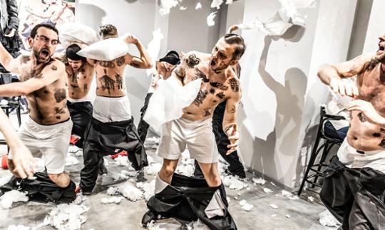 Energetyczny spektakl, w którym na oczach widzów powstaje scenografia widowiska o rewolucji z jej głównym bohaterem Maratem w roli głównej. Aktorami tego widowiska są, wymykający się nieustannie władzy dyrektora, niesubordynowani więźniowie, których reżyseruje sam Markiz de Sade. Całość układa się w tragikomiczną opowieść o uniwersalnych mechanizmach rządzących światem.