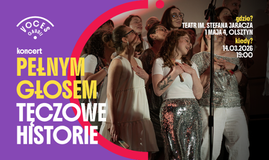 14 marca 2026 roku po raz pierwszy zaprezentujemy go w Olsztynie, na deskach Teatru im. Stefana Jaracza. „Pełnym Głosem – Tęczowe Historie” to nasz flagowy cykl koncertowy, w którym opowieści o codzienności i doświadczeniach – opowiadane pełnym głosem, z otwartością i dumą – przeplatają się z utworami wykonywanymi przez chór, tworząc wielogłosową opowieść, w której słowa i muzyka wzajemnie się dopełniają.