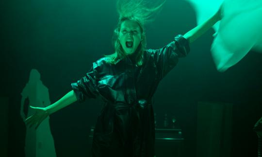 W spektaklu wykorzystane jest światło stroboskopowe.