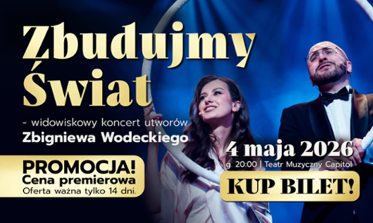„Zbudujmy świat - Utwory Wodeckiego w nowym świetle” to wypełniony emocjami spektakl, który przeniesie publiczność w magiczny świat niezapomnianych przebojów Zbigniewa Wodeckiego – tym razem w nowych, współczesnych aranżacjach Mateusza Walacha, wykonanych z towarzyszeniem Orkiestry Kameralnej Silesian Art Collective.