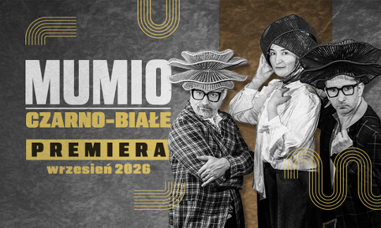 Nowy spektakl Mumio to podróż do wyjątkowego, czarno-białego świata inspirowanego estetyką lat 60. i 70. Na scenie spotkają się Jadwiga Basińska, Dariusz Basiński i Jacek Borusiński, którzy wraz z muzykiem Rafałem Kierpcem stworzą muzyczno-liryczną rzeczywistość pełną absurdalnego humoru, piosenek i charakterystycznej dla Mumio wyobraźni.